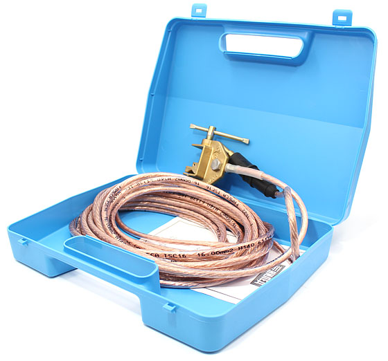Подсоединяется к устройству М6D или М7D. Длина гибкого медного провода 10 м, сечение 16 мм2. Устройство заземления MaT состоит из штекера заземления, вставляемого в байонетный разъем устройств M6D, M7D и гибкого медного провода со струбциной, присоединяемой к заземляющему устройству.