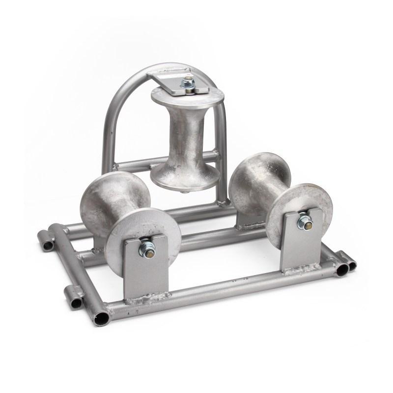 Шкивы ролика РКУ-140 изготовлены из алюминиевого сплава. Закрытые подшипники надежно защищают узел оси вращения от попадания грязи и обеспечивают нормальную работу ролика в течение всего срока службы. Узлы в виде петель позволяют легко стыковать угловые ролики между собой специальным штырем повторяя контур кабельной линии в местах поворота