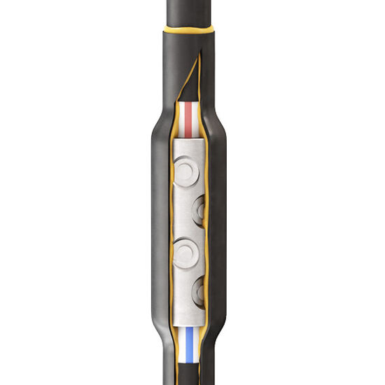- Комплект состоит из болтового соединителя с угловым расположением болтов и термоусаживаемой манжеты с клеевым слоем