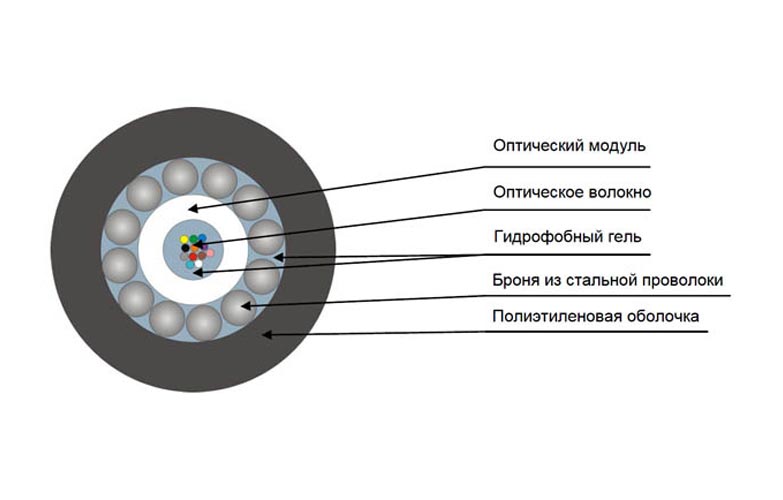 Конструктивно представляет собой центральный оптический модуль, защищенный броней из стальных оцинкованных проволок и наружной оболочкой из полиэтилена средней плотности. Свободное пространство в оптическом модуле и между стальными проволоками заполнено гидрофобным гелем.
